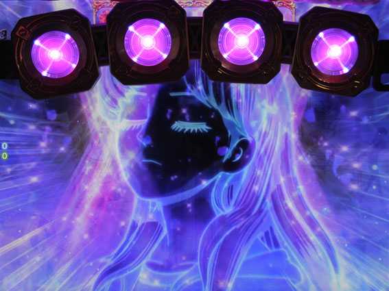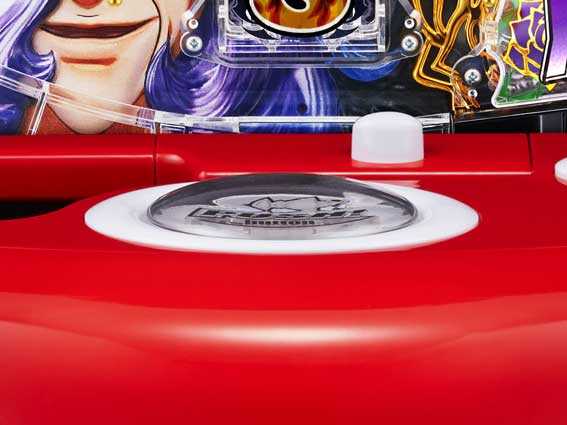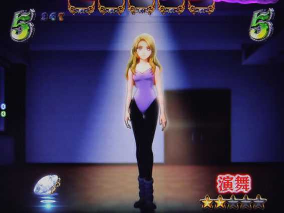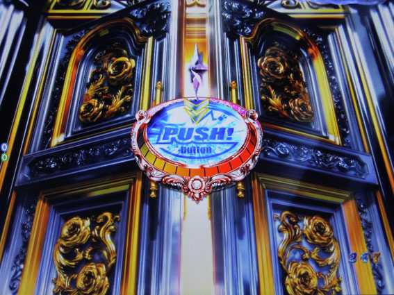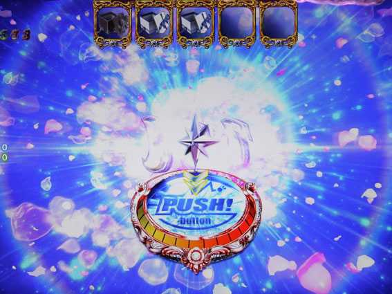 図柄揃い直後は昇格演出が発生(リーチによっては発生しないこともアリ)。ボタンPUSHでスポットライトギミックが落ちれば赤図柄揃いに昇格。