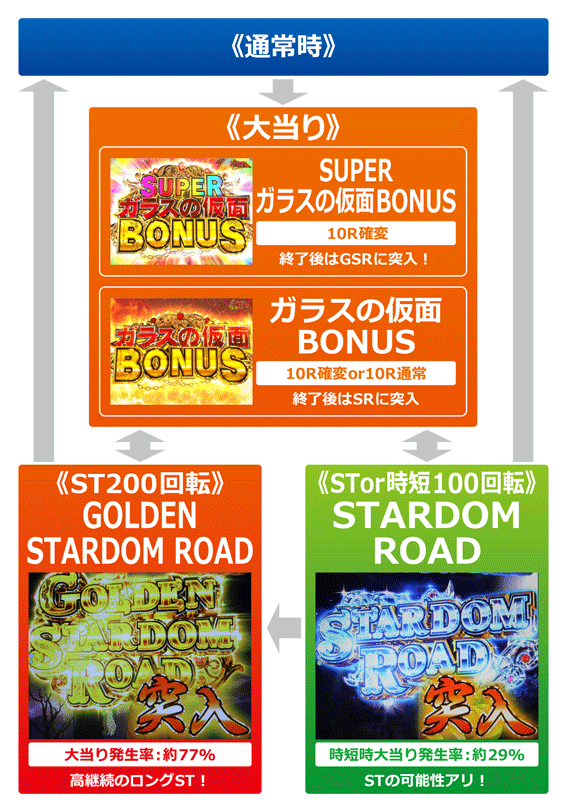 SUPERガラスの仮面BONUS後はGOLDEN STARDOM ROAD(GSR)、ガラスの仮面BONUS後はSTARDOM ROAD(SR)に突入。GSRはST状態濃厚で、SRは基本的に時短だがSTの可能性もあり、その場合は100回転目の扉演出成功を経てGSRに突入する。