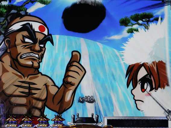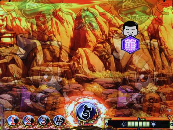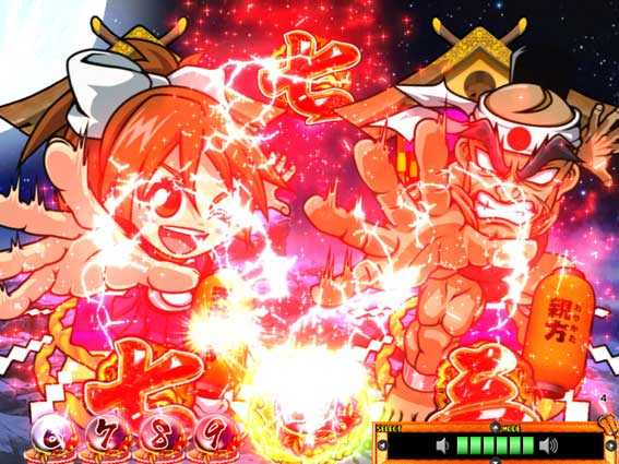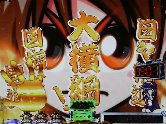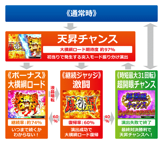 大横綱ロードはいつまで続くかわからない完全自力型ボーナス(約50個以上獲得)で、消化中は1/32の確率で激闘へ移行。激闘は大横綱ロードの継続をジャッジする演出で、60%で大横綱ロード継続、40%で超開眼チャンスに突入する。