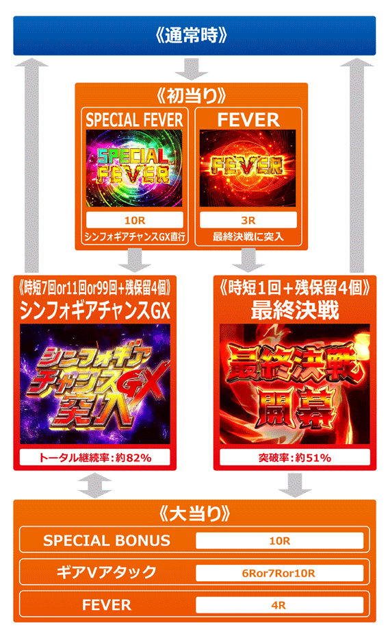 通常時の当選は3Rで、終了後は最終決戦に突入。右打ちモード中は4R(ラウンド中にSPECIAL FEVERへの昇格もアリ)で、終了後はシンフォギアチャンスGXに突入する。
