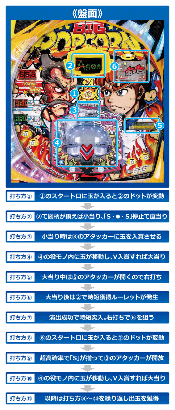 通常時は左打ちで①のスタート口を狙う。①に玉が入ると②のドットが変動し、同じ図柄が3つ揃えば小当り&ポップコーンチャレンジ発生、「S・●・S」(※●はBorR)が止まると直撃当りとなりポップコーンボーナスが発生する。
