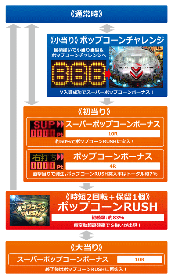 時短2回転(+残保留1個)の右打ちモードで、継続率は約83%。最大3変動の間、アタッカー14回開放のS図柄揃いが超高確率で出現するためポップコーンチャレンジ成功率が高く、かつ全大当りが10Rとなる。大当り終了後はポップコーンRUSHに再突入する。