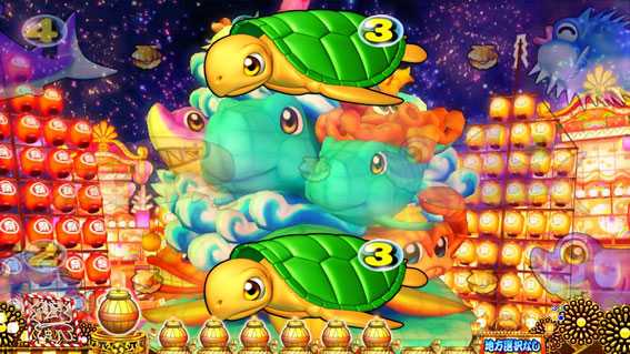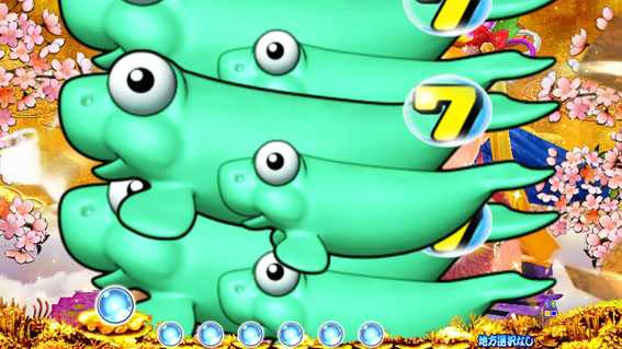 フクロウや鶴など様々なキャラが通過し、数が多いほどチャンス。GOLDクジラッキーなら奇数図柄揃い以上濃厚!