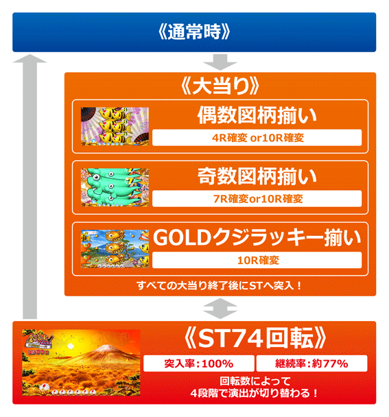 全大当り終了後に突入する74回転のST。電サポは70回転で終わるが、残り4回転は電サポなし状態となる。また、回転数によって演出が4段階で変化する。