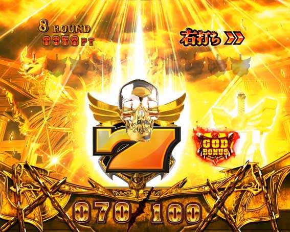 電サポ中に7図柄が揃うと発生する超プレミアムボーナス。10Rの大当りが立て続けに3回発動するぞ。終了後はGOD GAMEに突入する。