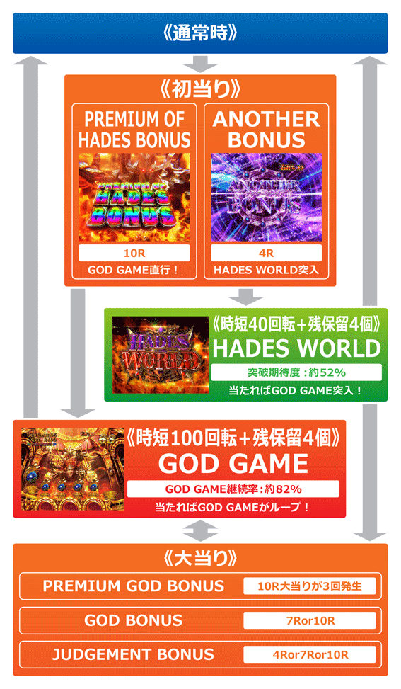 通常時の大当りは99%がANOTHER BONUSとなり、終了後は40回転の時短「HADES WORLD」に突入。ココで大当りを引き戻せば晴れてGOD GAME突入となる。