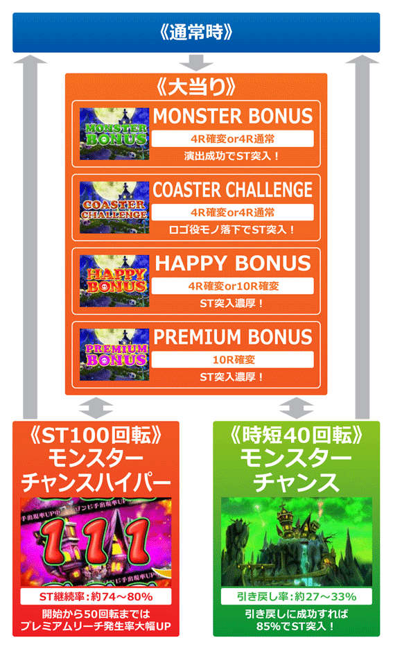 通常大当り後に突入し、40回転継続。引き戻し率は約27%以上で、当たれば85%でSTに突入する。