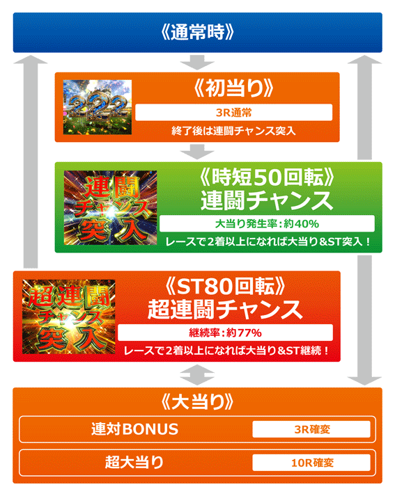 電サポ80回転、継続率約77%のSTモード。演出の流れは時短の連闘チャンス中とほぼ同じで、図柄がテンパイするとレース演出に発展。最終的に1着になれば10R確変&ST継続、2着なら3R確変&ST継続となる。