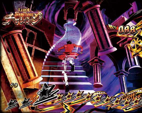 継続率約71.5%の右打ち連チャンモード。演出は3部構成で、いずれのステージも当たればトータル出玉約2000個の「これぞ究極!天下無敵の超大当り」発生&LUPIN THE SHOW TIME継続となる。