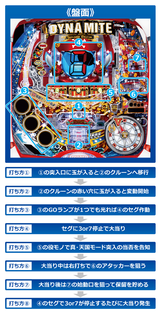 左打ちで①に玉が入ると直接②のクルーンへ移行。クルーン中央にある赤い穴に玉が入ると変動が始まり、③の3連GOランプのうち1つでも「GO」が表示されれば④のセグが作動。最終的に3or7が停止すれば大当りとなり、宝箱ジャッジメントが発生。演出成功で6R&真・天国モード突入、失敗時は1R分の出玉を獲得後に通常時に戻るぞ。なお、大当り&真・天国モード中はナビに従って右打ちで消化すればOKだ。