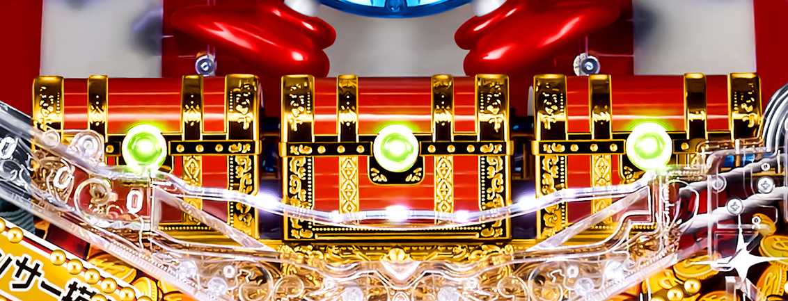 残保留のラスト1個は、初当りの宝箱ジャッジメントと同様の宝箱選択演出が展開。お宝発見で7図柄停止大当りだ!