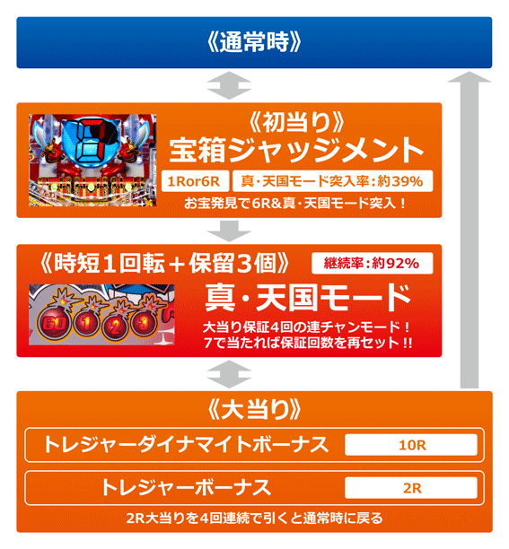 通常時はセグに3or7が停止すると宝箱ジャッジメントが発生。3つの宝箱の中からお宝を発見できれば真・天国モードに突入する。真・天国モードは4回の大当りが保証される右打ちモード(大当り確率1/1)で、セグに3が停止すれば2R、7停止なら10Rの大当りが発生。4回の大当りのうち、1回でも7が止まれば、残り大当り回数が4回に再セットされる。4回連続で2Rを引かない限り真・天国モードは終わらないぞ。