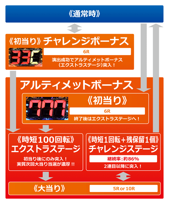 出玉獲得のメイン契機「アルティメットボーナス」へは、初回3or7図柄揃い、またはチャレンジボーナス中の演出成功を機に突入(トータル突入率は50%)。ゲームの流れとしては、初当りの出玉を獲得するとエクストラステージへ移行し、超高確率で次回大当りに当選。2回目の大当り後はチャレンジステージへ移行し、時短1回転と残保留1個で大当りを抽選する。チャレンジステージでの大当り当選率、すなわち継続率は約86%となっている。