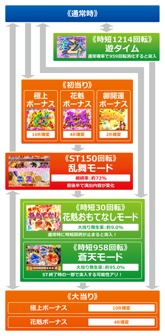 ※「蒼天モード」「花魁おもてなしモード」中の大当り時はST150回+蒼天モード958回