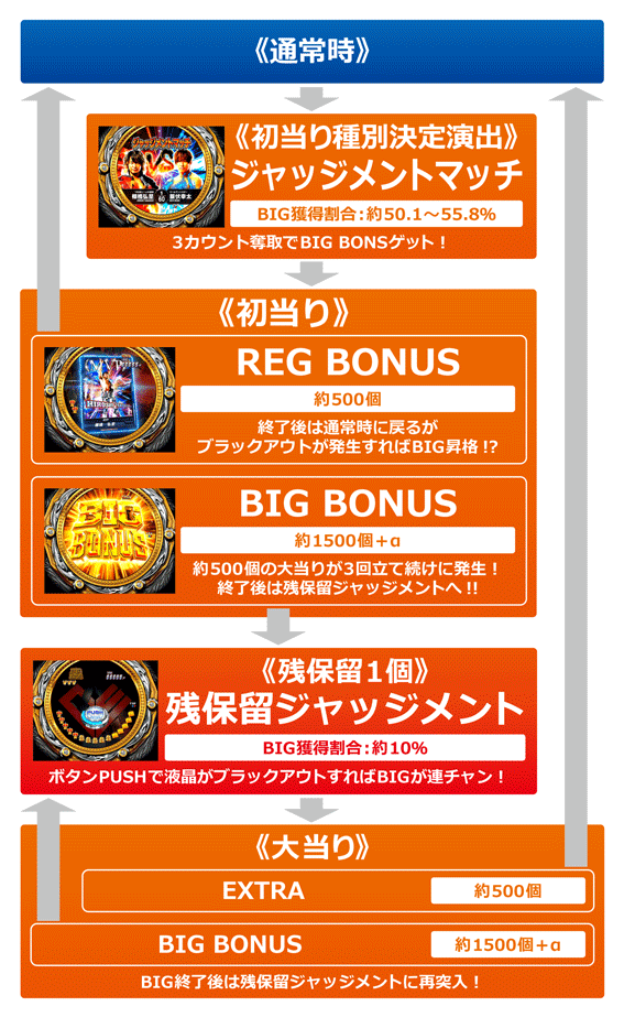 大当り(出玉約500個)の1G連が3回発生することで、トータル約1500個の出玉を獲得できる。3回目の大当り終了後は、残保留ジャッジメントにてBIG再当選かEXTRA当選かが決定される。