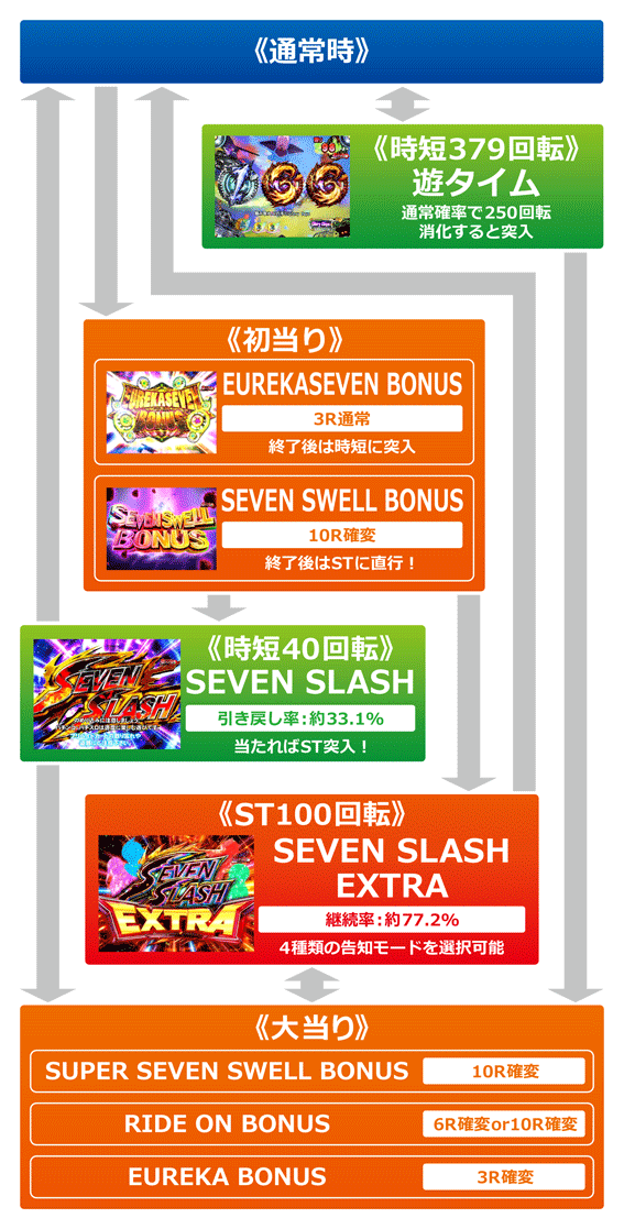 初回大当りの99%が、終了後に40回転時短「SEVEN SLASH」へ突入。時短中に大当りを引き戻せばST突入となる時短突破型スペックだ。また、本機は遊タイムも搭載しており、通常確率で250回転消化すると379回転の時短へ突入する。