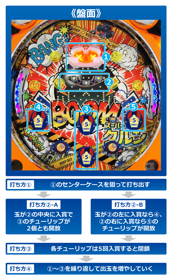 まず盤面上部にある①のセンターケースを狙って打つ。玉が①に入ると②の3連チャッカーのいずれかへ入賞するチャンスとなり、入賞すれば③or④or⑤のチューリップが開放。3連チャッカーの左に入賞なら④、中央入賞なら③(2個とも開放)、右入賞なら⑤が開放し、どのチューリップも玉が5個入ると閉鎖する。この一連の流れを繰り返し、出玉を増やしていくことになる。