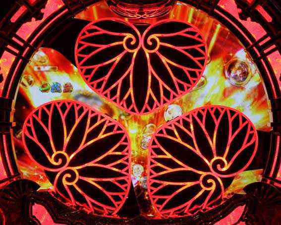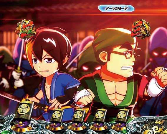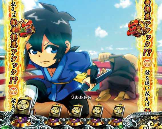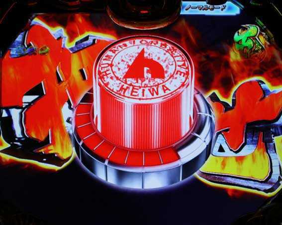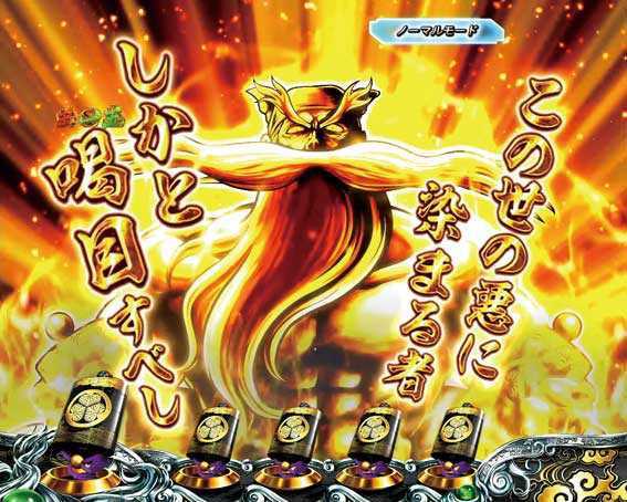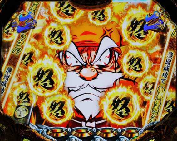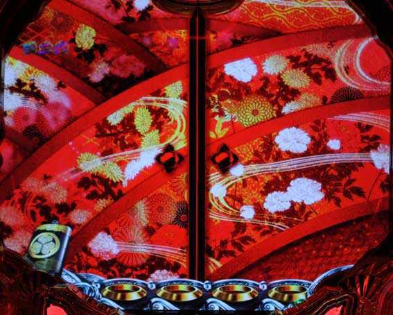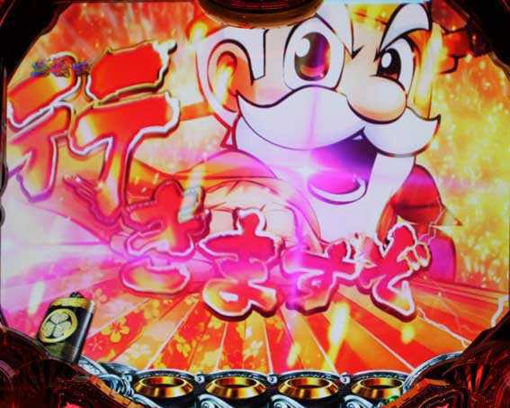 ノーマルリーチ停止後に発展し、ボタンを押してドデ家紋を完成させれば大当り。ボタンが連打ではなく、一撃ならチャンスアップ!
