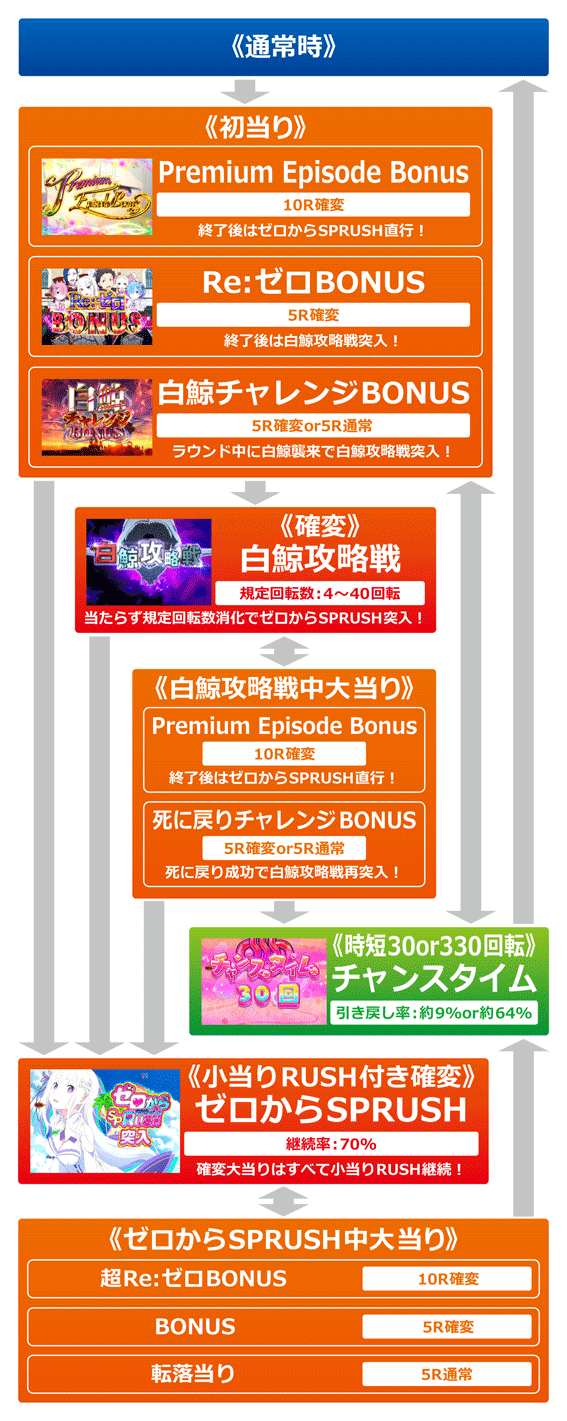 初当りは3種類あり、10R確変ならゼロからSPRUSH、5R確変なら白鯨攻略戦、5R通常ならチャンスタイム突入。初当りの多くが白鯨攻略戦に突入する。