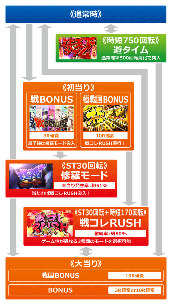 初回大当りの大半は、終了後にST30回転の修羅モードへ突入。大当り発生率は約51%で、当たれば戦コレRUSHに突入する。
