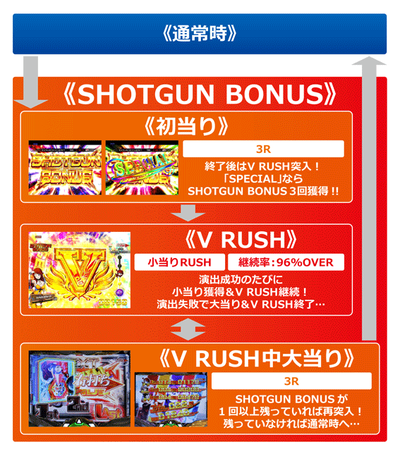 すべての初回大当りでSHOTGUN BONUSに突入。まず3R分の出玉を獲得し、続いてV RUSH(小当りRUSH)がスタート。大当りを引くまで、平均出玉約75個の小当りが96%超という高い確率で連チャンするぞ。大当りに当選するとV-RUSH終了となり、3R分の出玉獲得後に通常時へ戻る。ただし、初回大当りが「SPECIAL」だった場合は、SHOTGUN BONUSを合計3回消化するまでV RUSHに再突入するぞ。