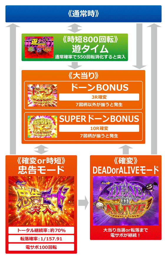 すべての大当り終了後に確変「忠告モード」へ突入する転落抽選タイプ。忠告モード中は、転落せずに100回転を消化するとDEADE or ALIVEモードへ移行し、大当りor転落まで電サポが継続。忠告モードの途中で転落した場合は、大当り終了から100回転経過で電サポ終了となる。