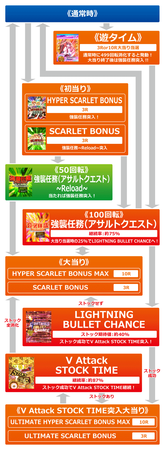 初回大当りの50%、または遊タイム経由大当りを機に100回転の強襲任務(アサルトクエスト)へ突入。強襲任務は継続率約76%のST風連チャンモードで、大当り当選時は25%の確率でLIGHTNING BULLET CHANCEが発動し、規定時間内にストックを獲得すれば第2の連チャンモード「V Attack STOCK TIME(VAST)」に突入する。