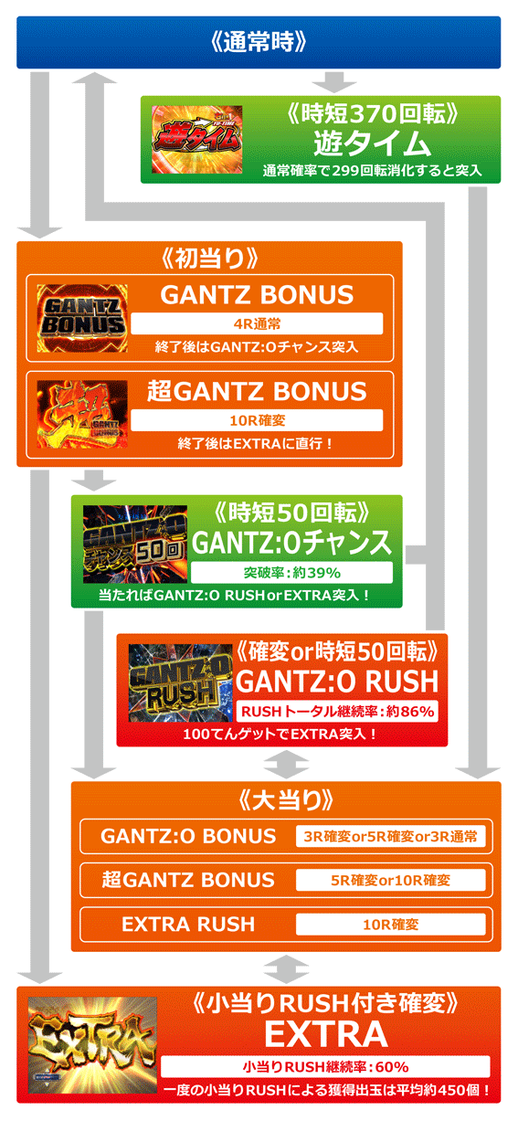 初回大当りの大半が時短50回転のGANTZ:Oチャンスに突入するいわゆる時短突破型で、電サポ中に当たればGANTZ:O RUSH、またはEXTRAに突入。なお、小当りRUSHの継続率は、シリーズ最高の60%となっている。