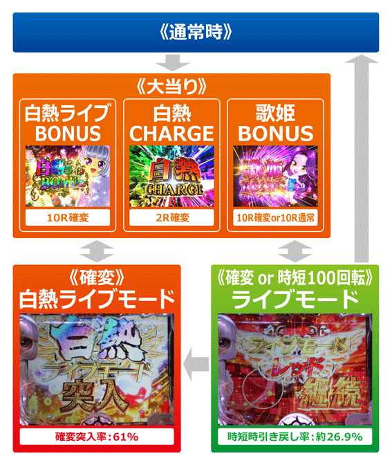 ゲームの流れはシンプル。大当りの多くが数字図柄揃いによる歌姫BONUSとなり、終了後にライブモードへ突入。ライブモードは時短or確変の電サポモードで、内部的に確変であれば100回転経過後に白熱ライブモードへ移行するぞ。A図柄揃いで発生する白熱ライブBONUSや、2R確変の白熱CHARGE終了後は白熱ライブモードに突入する。