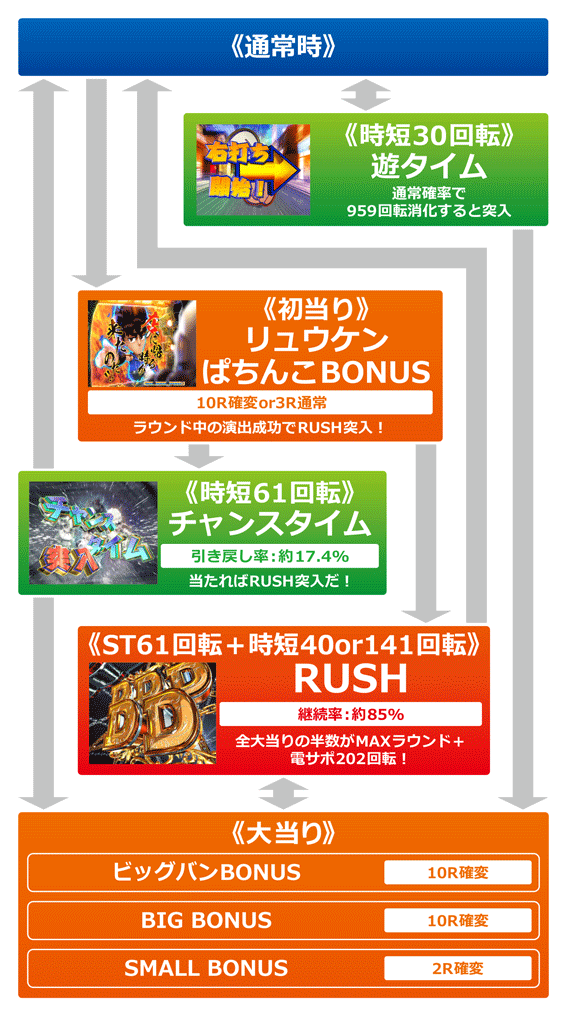 RUSHは上記3種類のモードで構成され、それぞれ異なる演出が展開。電サポ回数は101回転(ST61回転+時短40回転)、または202回転(ST61回転+時短141回転)で、202回転継続時の大当り期待度は約87.5%となっている。