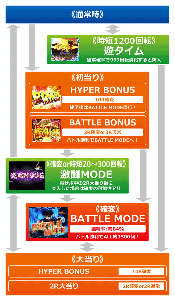 基本的には時短だが、右打ち中の大当り後のみ内部的に確変の可能性があり、その場合は60回転消化後にBATTLE MODEへ突入。初回大当り後の突入だと確変の可能性はないが最低50回転、最大で300回転継続する可能性がある。