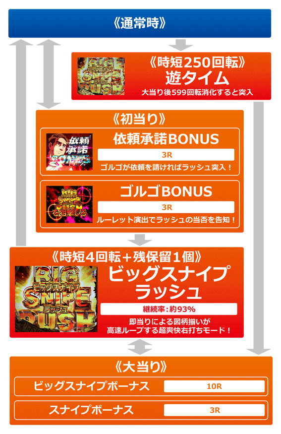 右打ち中は9割が3Rのスナイプボーナスとなる(基本的にタイトルコールはファイナルチャレンジ成功時のみ発生)。終了後はビッグスナイプラッシュに再突入する。