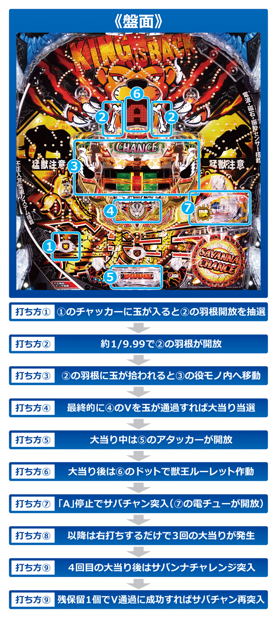 ①のチャッカーに入賞すると約1/9.99で②の羽根が開放。羽根に拾われた玉が役モノ内の障害を通過し、④のVを通過できれば大当り当選。大当り後は⑥のドットで獣王ルーレットが展開し、最終的に「A」が止まれば時短300回転のサバンナチャンスに突入。