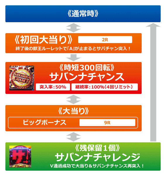 初回大当り後の獣王ルーレットで「A」が止まると突入。時短が300回転続くため、実質次回大当り当選濃厚だ。初当りを含む4回目の大当り終了で時短終了となり、サバンナチャレンジへ移行する。