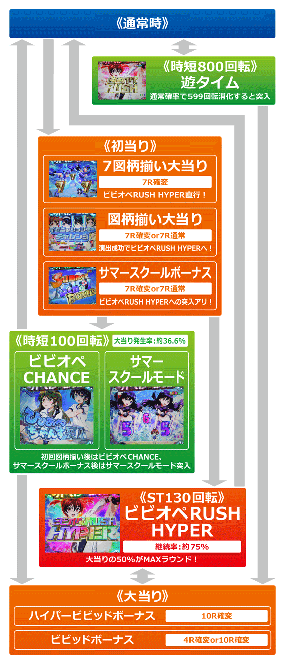初回通常大当り後は時短100回転のビビオペCHANCE or サマースクールモード、確変大当り後はST130回転のビビオペRUSH HYPERに突入。電サポ中は全大当りが確変となるため、時短引き戻しでSTへ突入することも少なくない。遊タイムは通常確率で599回転を消化すると発動し、時短800回転のビビオペRUSHに突入する。
