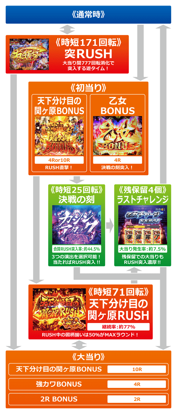 天下分け目の関ヶ原RUSHは基本的に71回転(+残保留4個)継続。専用演出が展開し、図柄揃い大当りの50%が出玉1000個の10Rとなる。