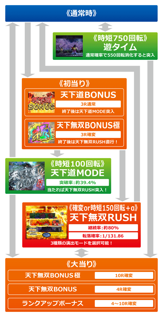 初回大当りの99%は、終了後に天下道MODEへ突入。電サポ100回転の時短モードとなっており、当たれば天下無双RUSHに突入する。時短突破率は約39.4%だ。