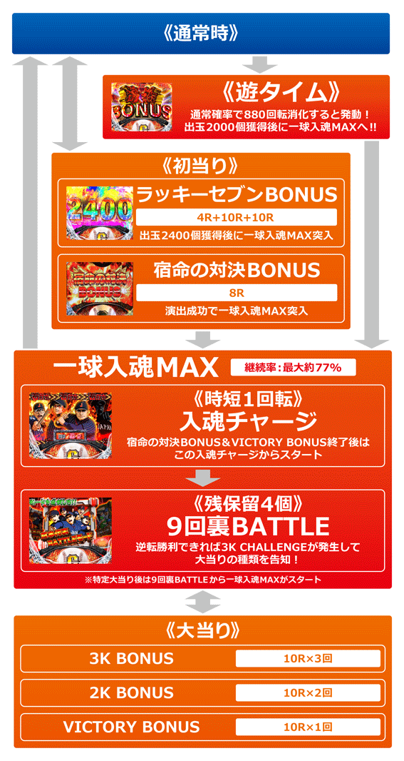出玉獲得の要となる一球入魂MAXへの突入契機は、初回7図柄揃い(ラッキーセブンBONUS)、宿命の対決BONUS成功、遊タイム発動後の大当り(激怒BONUS)終了後など。