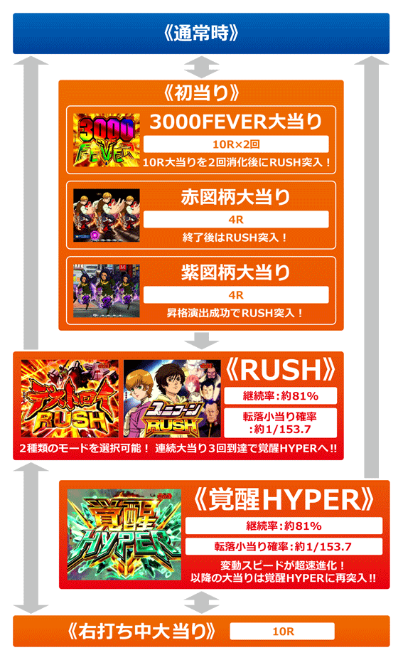 継続率約81%の右打ちモードで、デストロイRUSHとユニコーンRUSHの2種類から好みの演出を選択できる。RUSH中の大当りはすべて10RかつRUSH継続で、連続大当りが3回(初当り含む)に到達すると覚醒HYPERへ移行する。