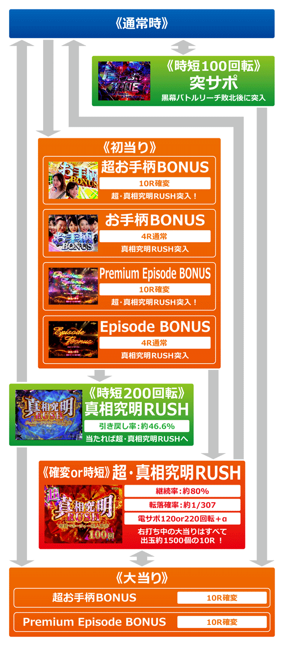 超・真相究明RUSHは転落抽選ありの電サポモード。継続率は約80%で、すべての大当りが出玉約1500個となる。転落するまで確変状態&電サポは終わらないが、規定回数(120or220回転)到達前に転落した場合は規定回数到達で電サポは終了する。