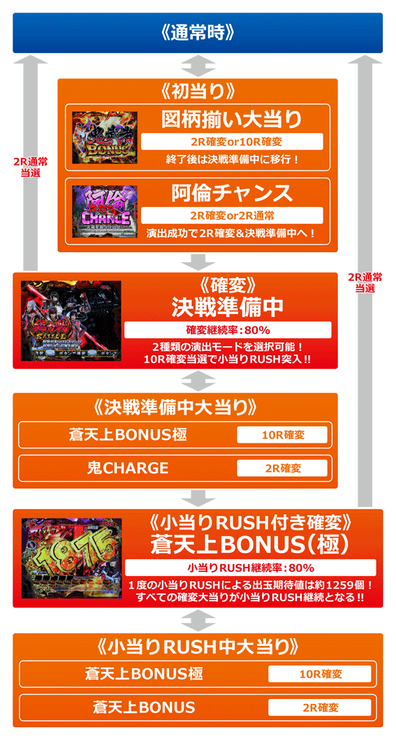 小当りRUSH突入、または継続が約束される10R確変大当り。終了後は、インターバルや突入告知ナシにすぐさま小当りRUSHが発動する(見た目は大当りが続いているように見える)。決戦準備中は全大当りの20%、小当りRUSH中は全大当りの13%が、この蒼天上BONUS極となるぞ。
