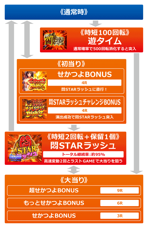 初回大当りが「せかつよBONUS」なら悶STARラッシュ直行、「悶STARラッシュチャレンジBONUS」なら演出成功で悶STARラッシュに突入。通常時に遊タイムへ突入した場合は時短が100回転続くため、実質大当り当選&悶STARラッシュ突入濃厚だ。