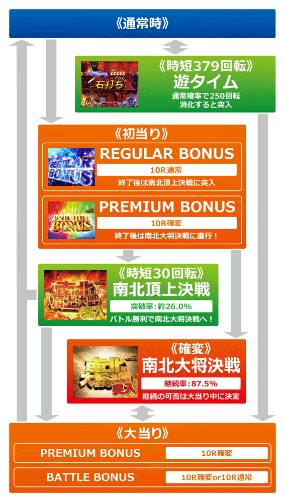 初回大当りの99%は、終了後に南北頂上決戦へ突入。電サポ30回転の時短モードとなっており、バトル勝利、またはプレミアムミッションなどの特定演出成功で南北大将決戦へ突入する。