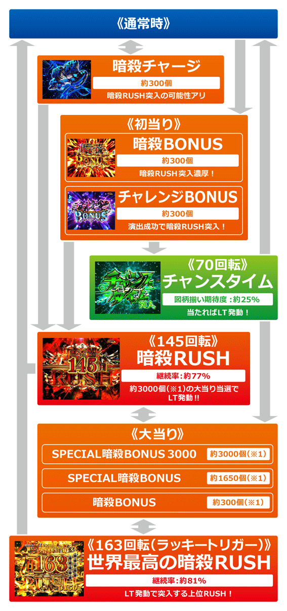 トータル約3000個(※)の出玉を獲得できる最上位ボーナス。すべての右打ちモードで発生する可能性があり、出玉獲得後はラッキートリガーの世界最高の暗殺RUSHに突入する。