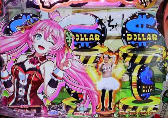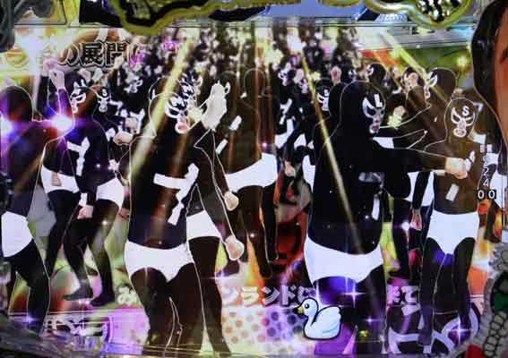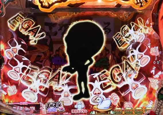 ボタンPUSHでエガちゃんが倒れた方向に対応した演出が発生。エガちゃんの動きが遅いとチャンスで、タイツを肩まで引き上げていると期待大。