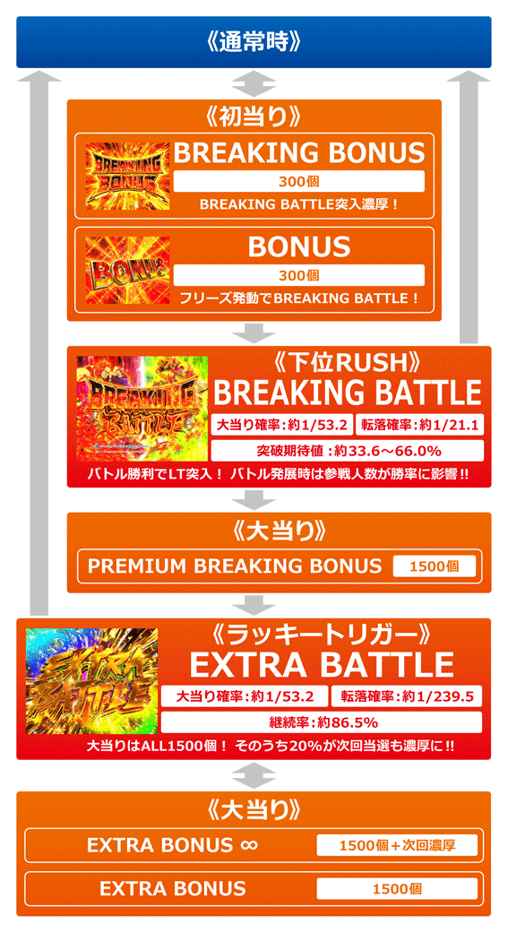 通常時にメインで発生する大当り。300個の出玉獲得後に発生するジャッジ演出成功でBREAKING BATTLE突入、失敗で通常時に戻る。
