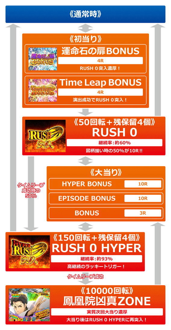 RUSH 0 HYPERは150回転のラッキートリガー。継続率が約93%にアップし、図柄揃い大当りはRUSH 0と同じく50%が出玉約1000個だ。また、LT中にタイムリープ発動に成功すると、実質次回大当り濃厚の鳳凰院凶真ZONEへ突入するぞ。