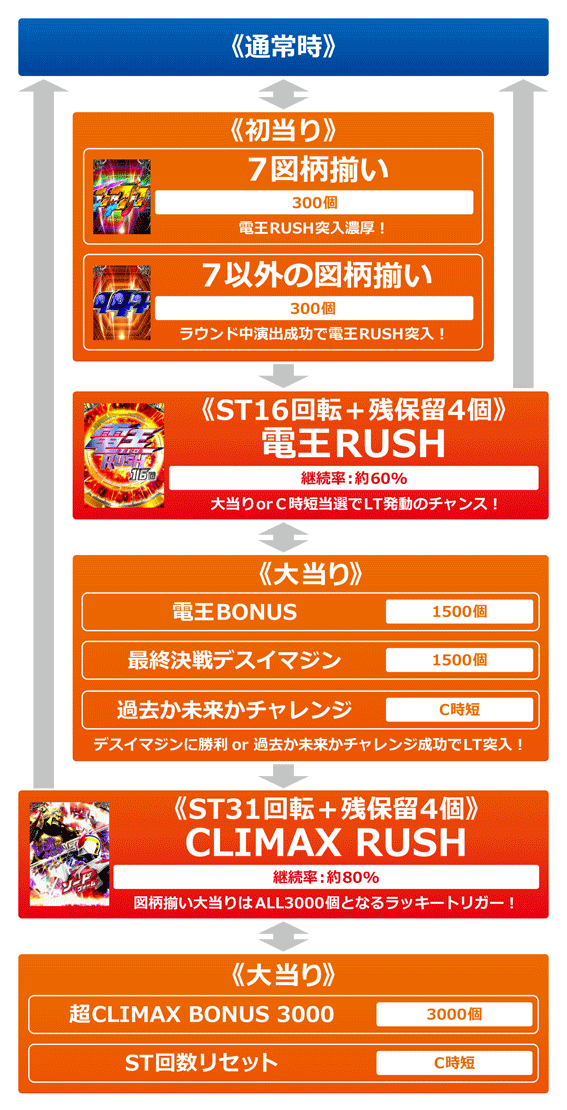 ※3…CLIMAX RUSH後の残保留で引き戻した場合は電王RUSH中と同じ振り分け。「継続率約80%」はLT終了時の残保留4個における引き戻し(約16.5%)を含む。