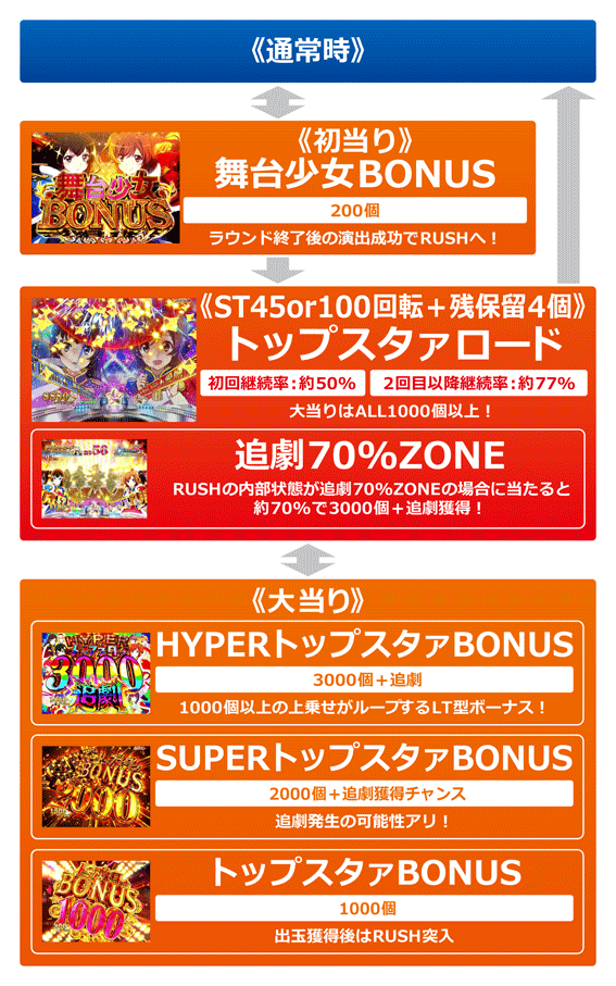 初当りの50%でRUSH「トップスタァロード」に突入。ST回数は初回突入時が45回転(+残保留4個)、2回目以降が100回転(+残保留4個)だ。RUSH中の大当りはすべて出玉1000個以上で、かつその1.6%が3000個+追劇(ラッキートリガー)、13.3%が1000個+追劇70%ZONEとなる。