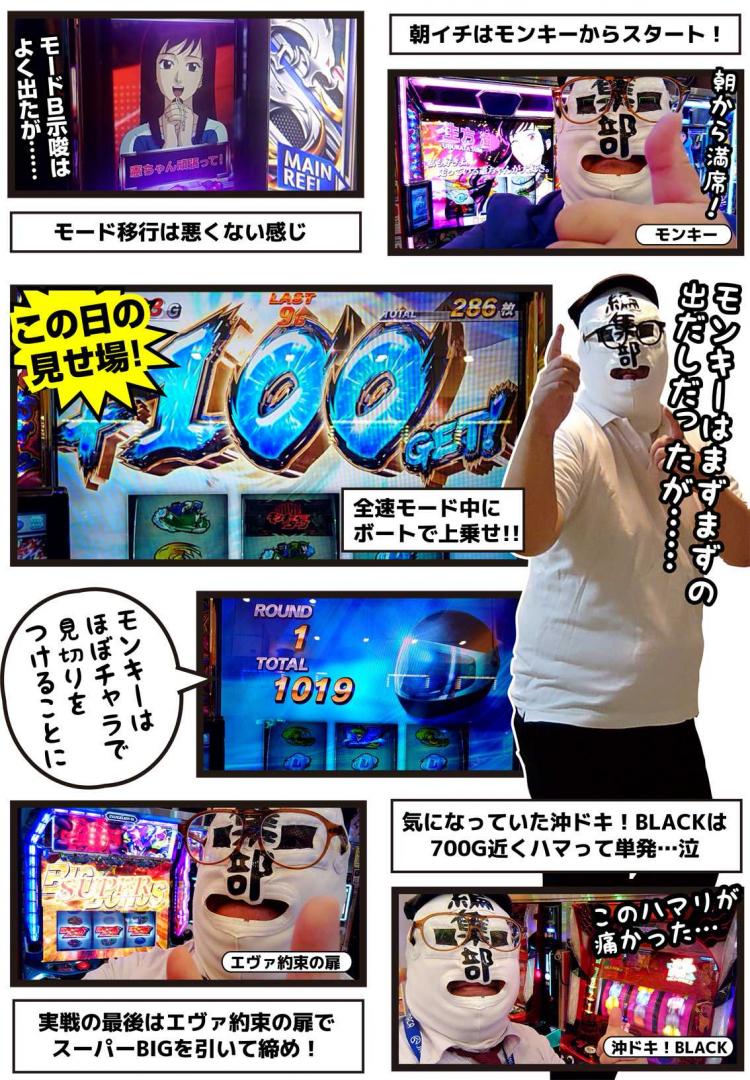 しかし、台移動した先の「沖ドキ!BLACK」と「沖ドキ!ゴージャス」に揉まれてしまい…、逃げるようにBT機の「エヴァ 約束の扉」へ移動。